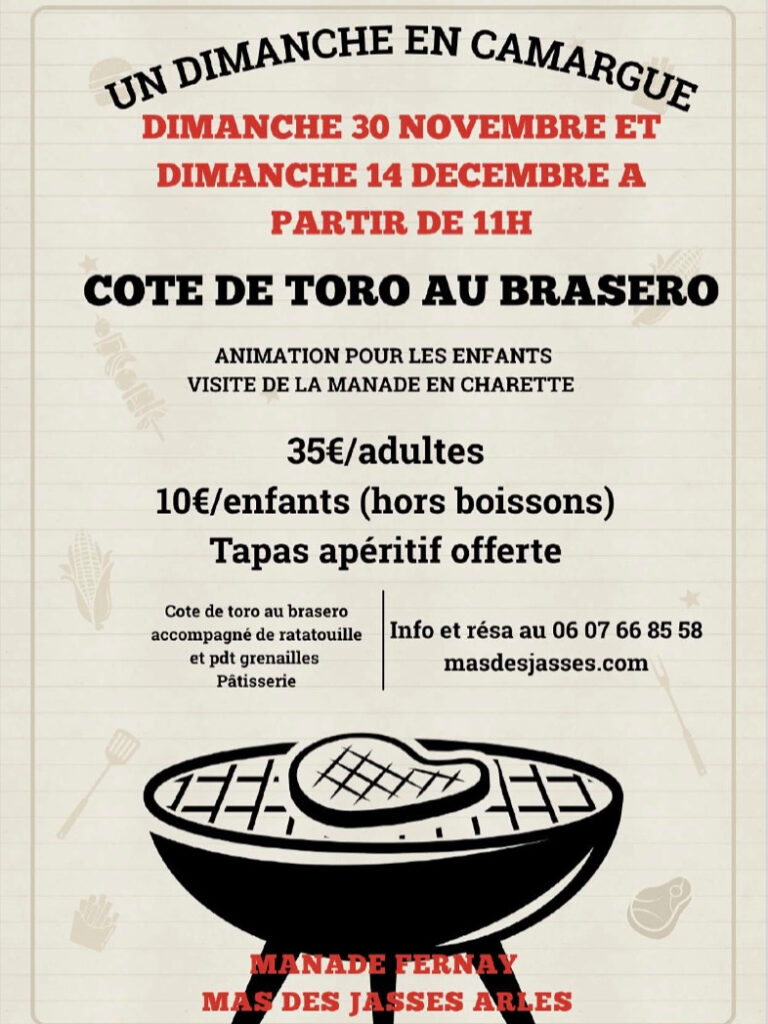 Un Dimanche en Camargue les 30 Novembre et 14 Décembre à 11H00. Profitez de venir passer un Dimanche en Famille ou entre Amis à La Table de la Manade, et déguster la Viande Toro de notre Elevage.